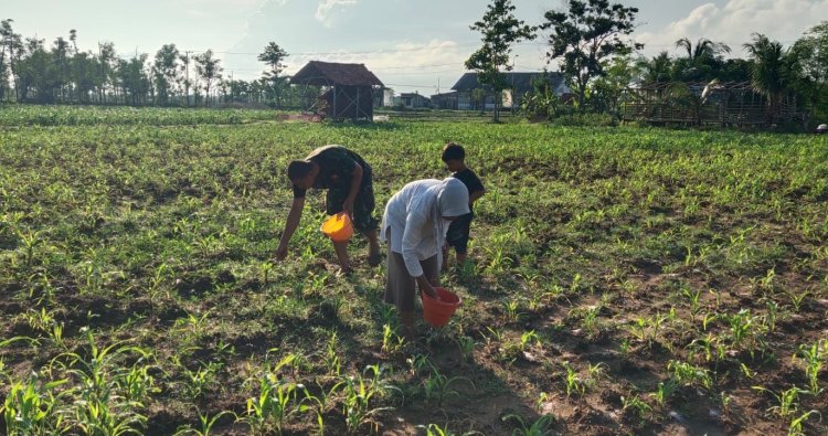 SAMPANG - Babinsa Pos Ramil 0828/13 Pangarengan, Serka Lery Ismanto, melaksanakan kegiatan pendampingan kepada petani dalam proses penaburan pupuk NPK pada tanaman jagung yang berlokasi di Dusun Rabesen, Desa Gulbung, Kecamatan Pangarengan, Kabupaten Sampang. Minggu (28/12/2025).